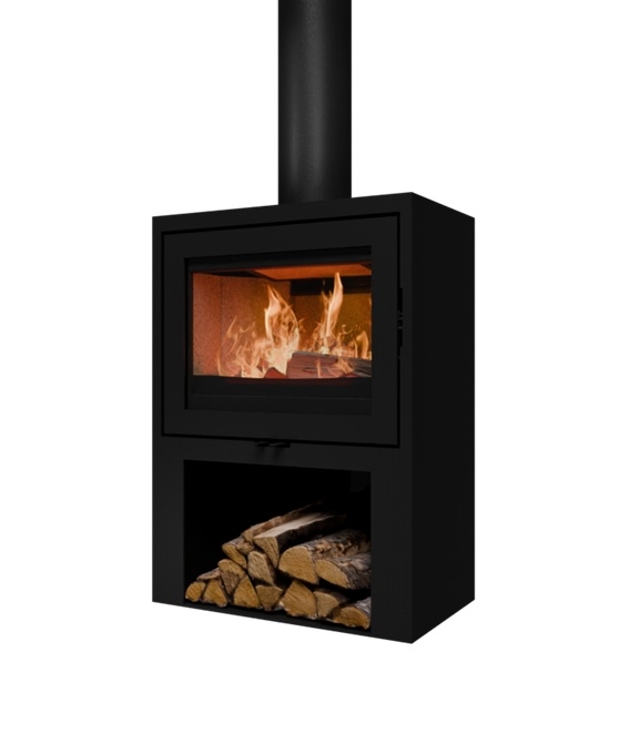 Moderní krbová kamna s čistým hranatým designem. Tento model kamen je ještě doplněn o podstavec s objemným úložným prostorem na dřevo. Velice elegantní řešení je absence kličky a otvírání za pomocí originálního klíče, který obdržíte s kamny. Ovládání vzduchu je decentně pod dvířky, takže obsluha je jednoduchá a nic zbytečně nenarušuje čistý vzhled kamen. Kamna jsou vybavena vyzdívkou z izolačního vermikulitu díky které je dosažena vysoká účinnost a velmi nízké emise. Komora je velice široká a tak umožňuje vkládat polena až 60 cm! Samozřejmostí je spalování dřevoplynů za pomoci sekundárního a terciálního vzduchu a airwash system (oplach skla vzduchem).